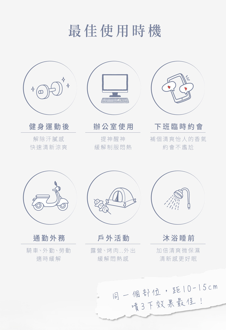 用法:使用前先搖一搖,距離肌膚10-15cm處噴灑,避開傷口、眼鼻黏膜與敏感部位。