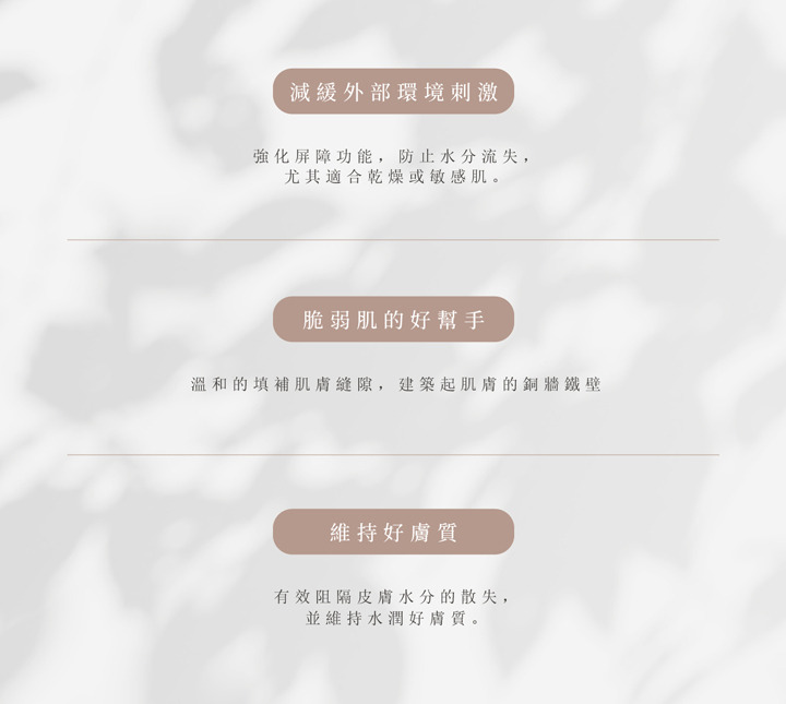 減少肌膚水分流失(鎖水),幫助肌膚屏障更健康,讓肌膚透亮、有光澤