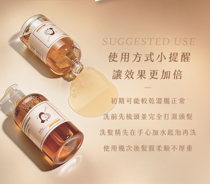 用法:取適量搓開泡沫後,至完全打溼毛髮上輕柔按摩搓揉頭皮毛髮,再以清水沖淨即可
