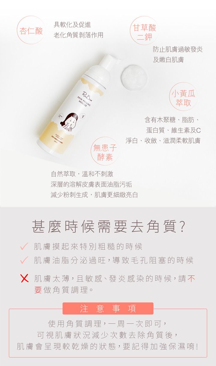 用法:適量抹於想要去除角質的肌膚部位,輕按搓揉,老舊角質就會呈屑狀脫落,再以濕巾擦淨或清水洗淨即可,去除角質後,請加強肌膚保濕。