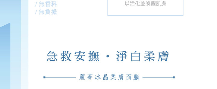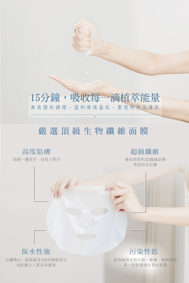 用法:於洗臉後直接敷貼約15至20分鐘取下,後以清水洗去殘留精華,接續保養程序。