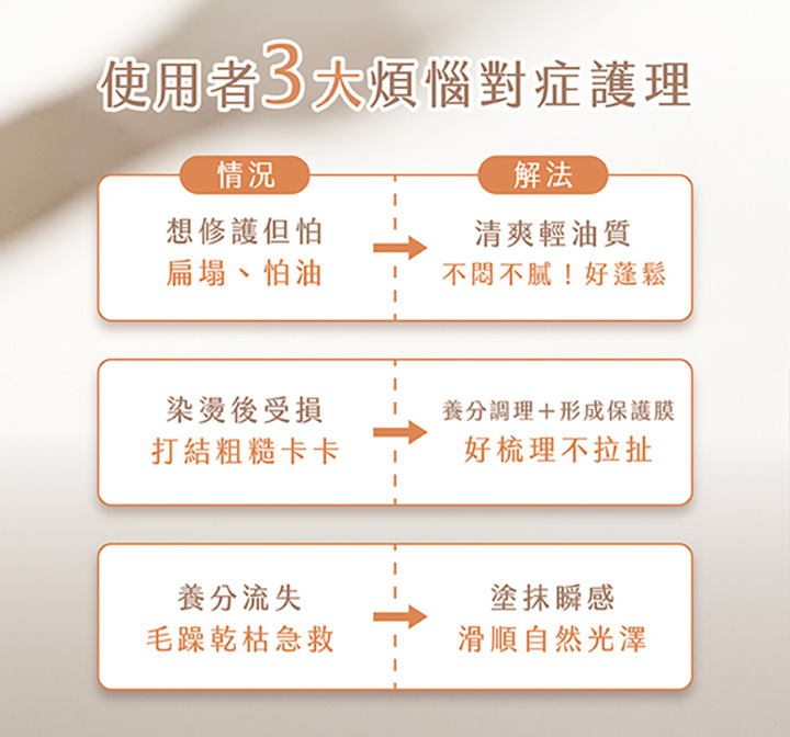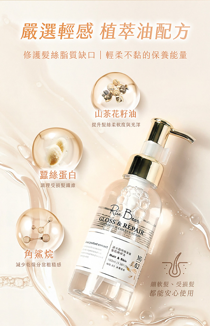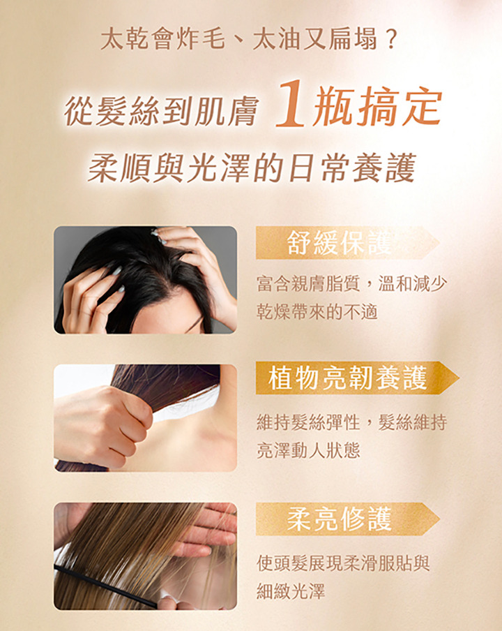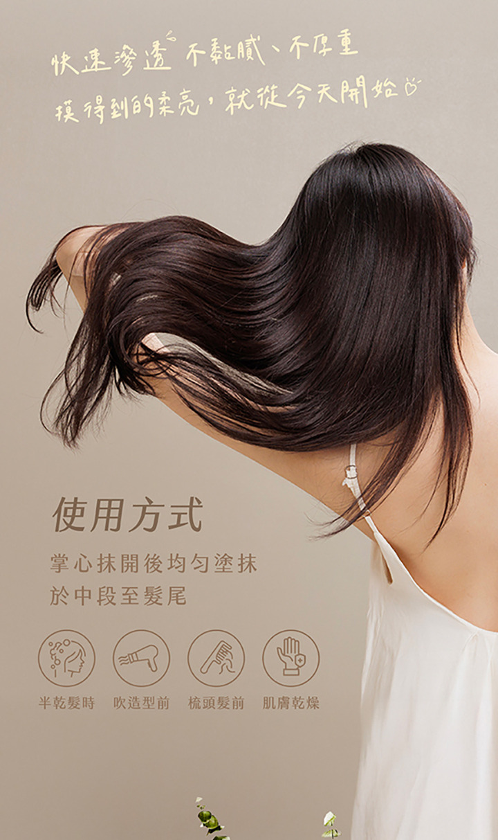 用法:頭髮清潔後半乾或濕髮時使用少許均勻地塗抹於中髮尾,乾髮時使用增加頭髮光澤,減少毛躁感。