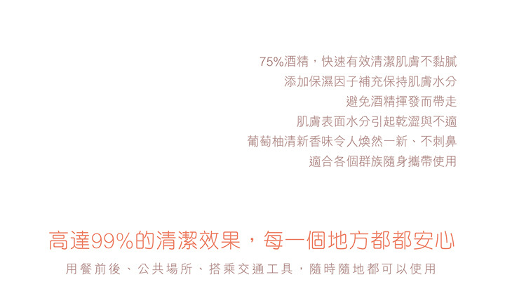 用途:清潔手部肌膚防止外在環境污染,減少細菌孳生機會。用餐前後、公共場所、搭乘交通工具,手部需保持清潔衛生時適用。